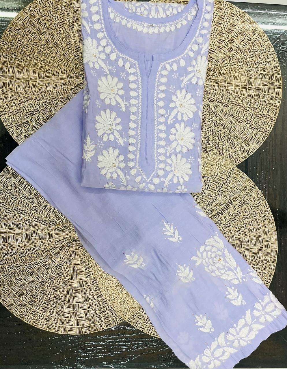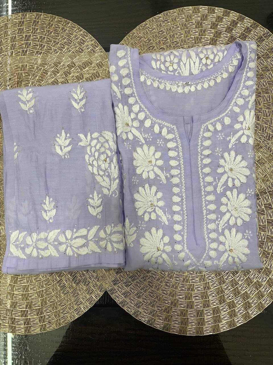 Baaju Kurung new Collection. Set of Chanderi Suit (Kurta and Plazo only) with Chikankari Work with light purple color.