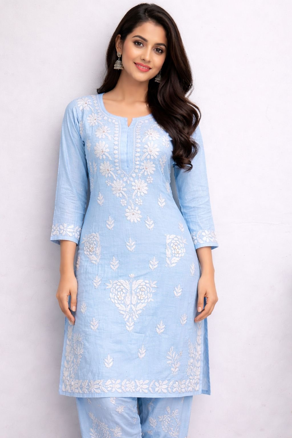 Baaju Kurung new Collection. Set of Chanderi Suit (Kurta and Plazo only) with Chikankari Work with sky blue color. Best Indian fashionable Collection.