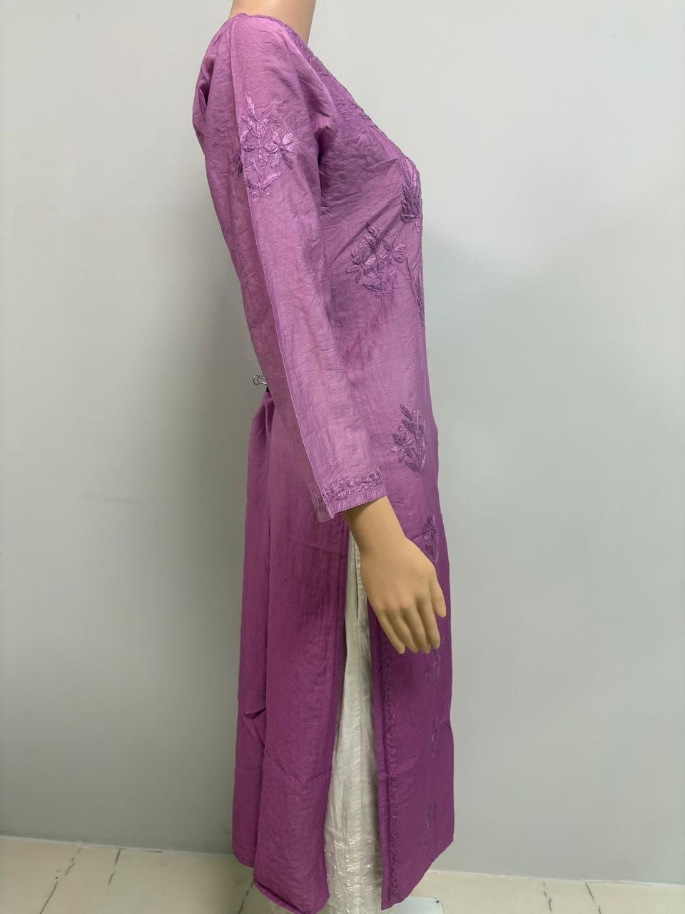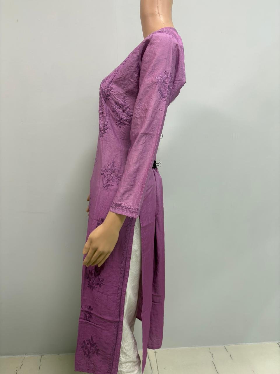 Made from comfortable and elegant Chanderi Fabric, this kurti features a color transition that changes from a Light Magenta color at the top to a Deep Magenta color at the bottom. This makes the kurti look stylish and elegant as it transitions from one color to another.