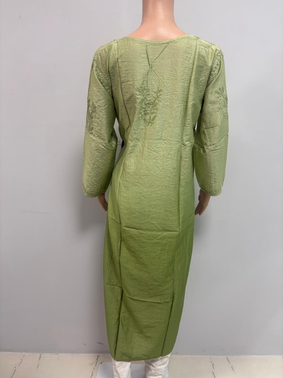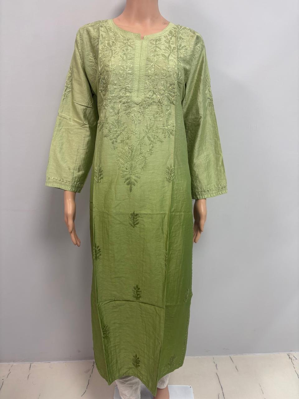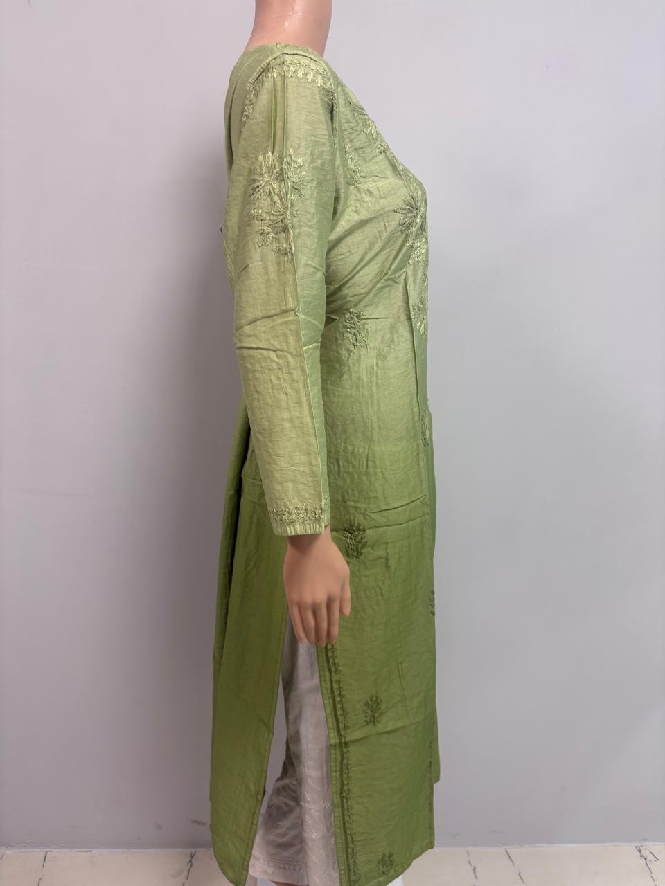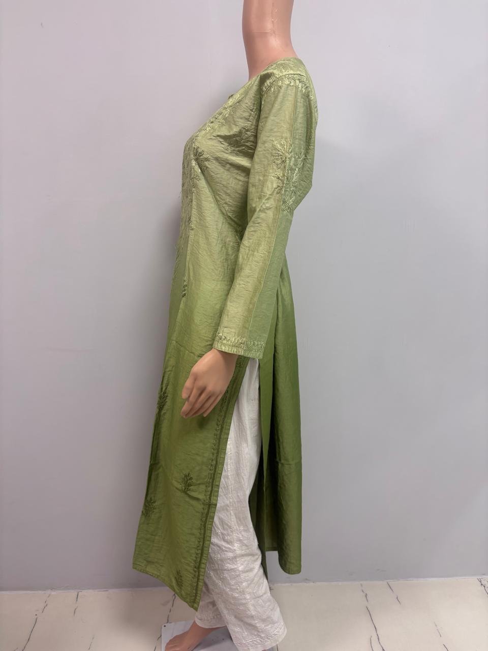 Chanderi Kurti with Color Transition and Chikankari Work | GreenChanderi Kurti with Color Transition and Chikankari Work | Green