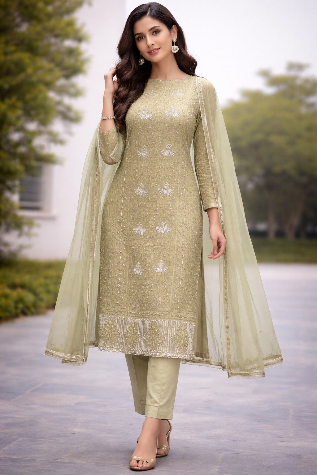 Georgette 3 Pc Suit with Cutdana, Pearl and Chikankari Work | Green