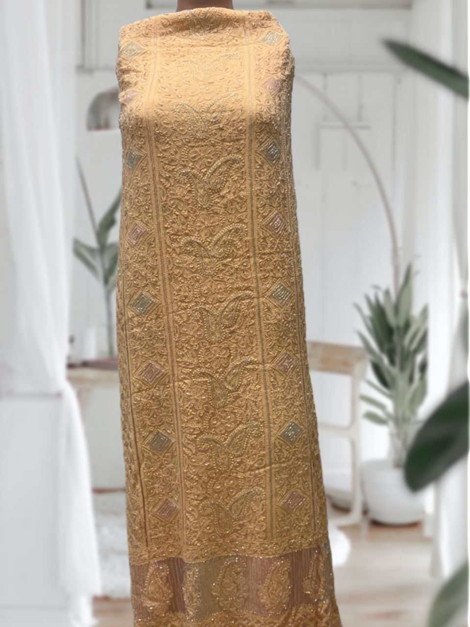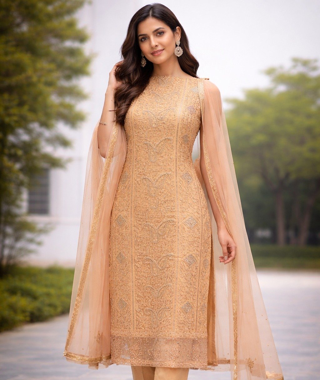 Georgette 3 Piece Suit with Cutdana, Pearl and Chikankari Work | Brown