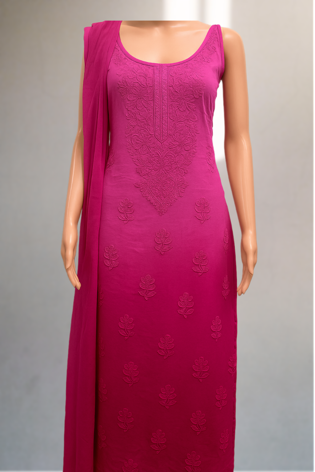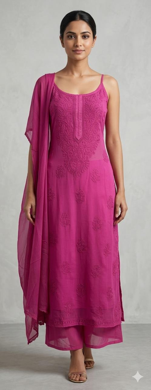 Baaju Kurung new Collection. Set of Georgette Strap Kurti, Palazzo and Chiffon Dupatta with Chikankari Work with pink color. Best Indian fashionable Collection.