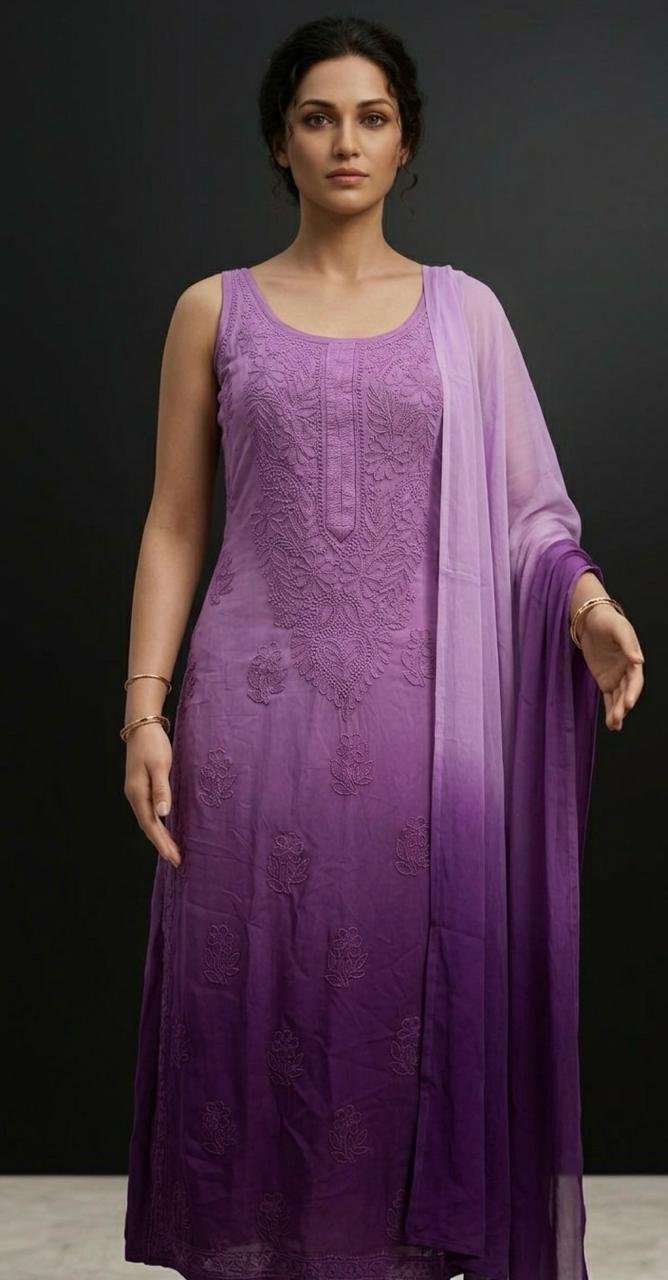 Baaju Kurung new Collection. Set of Georgette Strap Kurti, Palazzo and Chiffon Dupatta with Chikankari Work with purple color. Best Indian fashionable Collection.