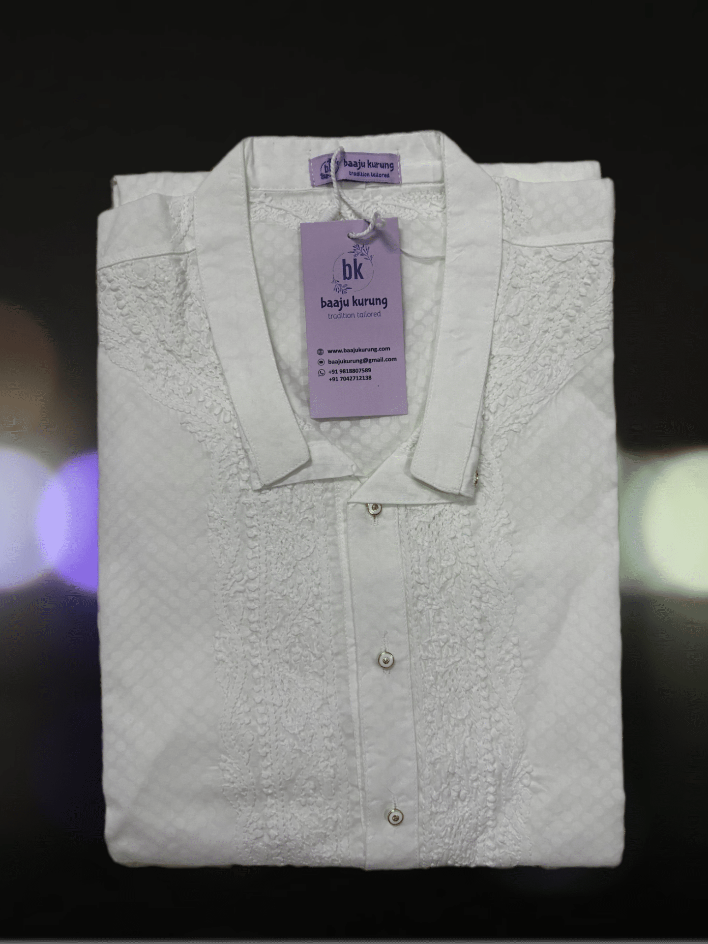 Baaju Kurung new Collection. Set of Men Kurta Pajama Brasso with Chikankari Work with white color. Best Indian fashionable Collection.