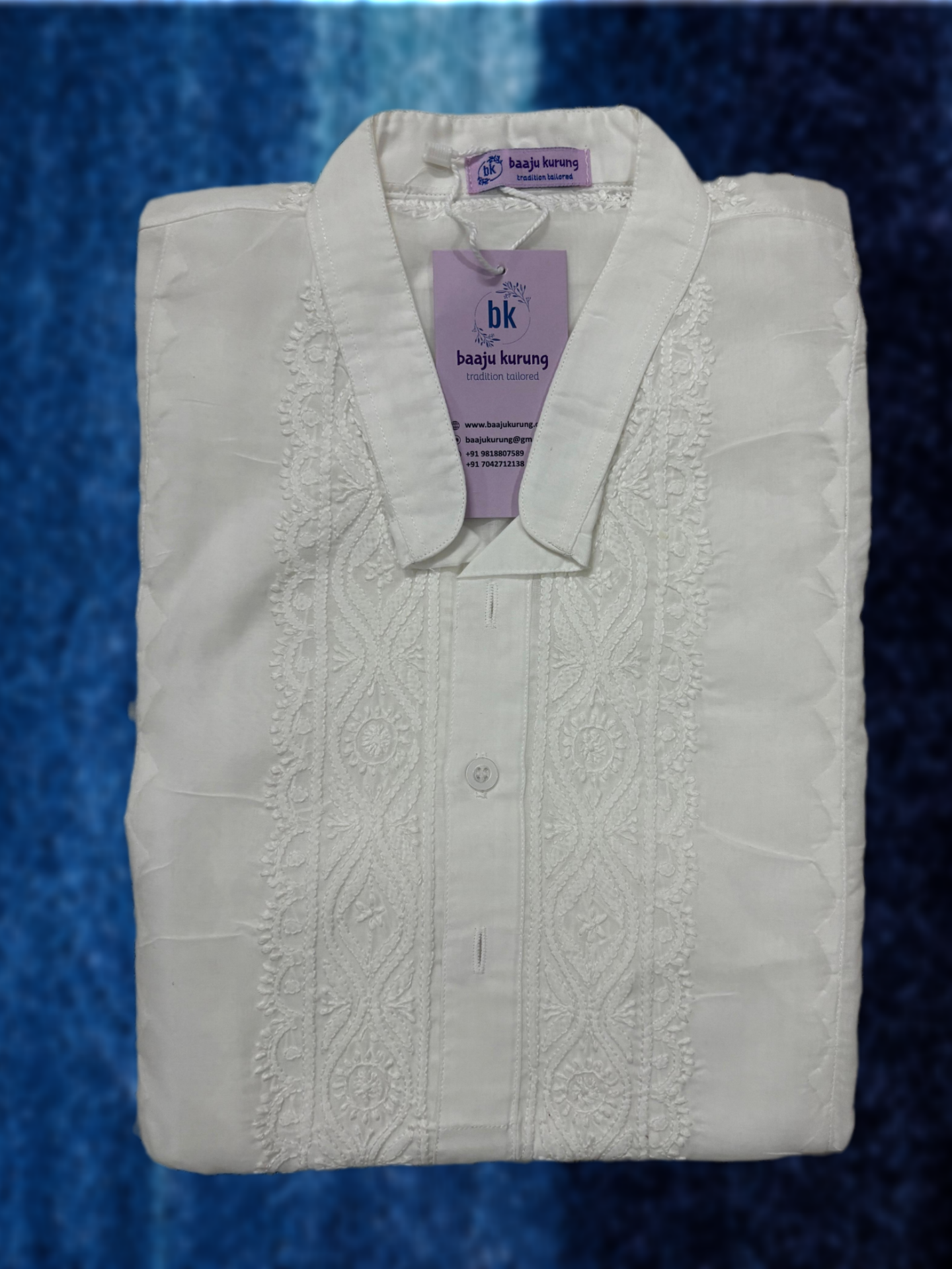 Baaju Kurung new Collection. Set of Men Kurta Pajama JAVA with Chikankari Work with white color. Best Indian fashionable Collection.