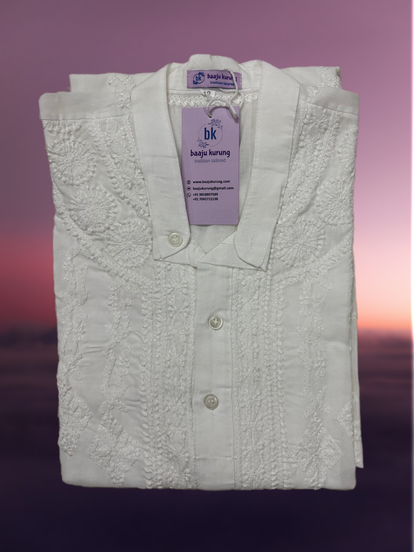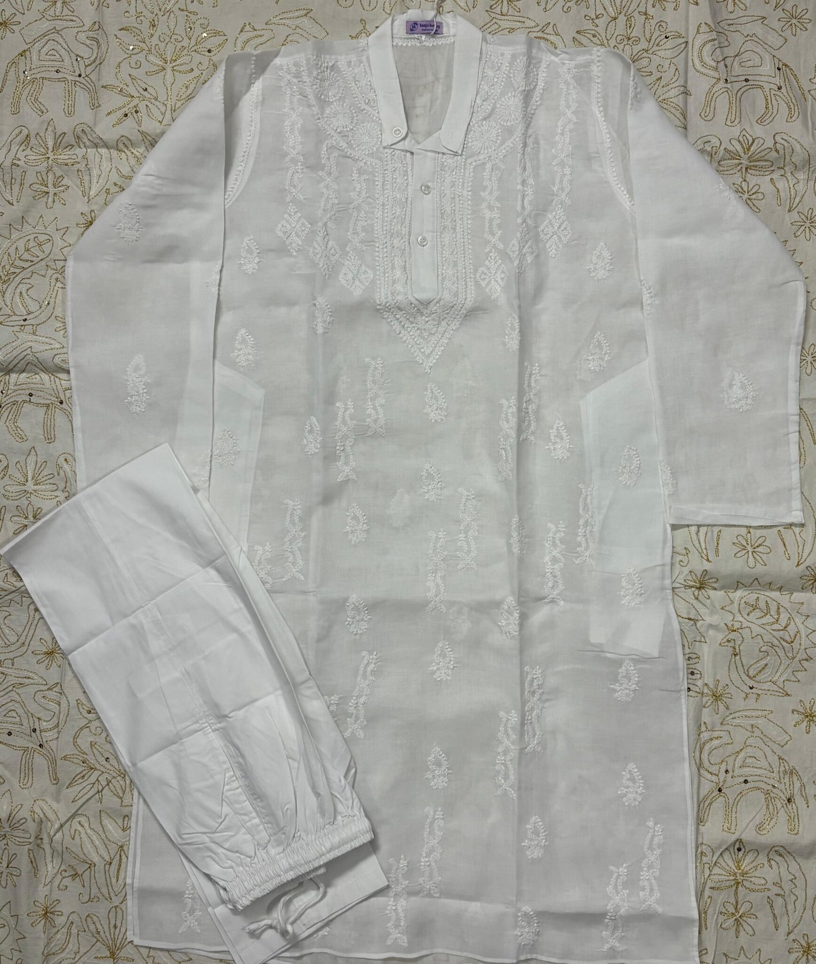 Baaju Kurung new Collection. Set of Men Kurta Pajama Neck and Booti Chikankari with white color. Best Indian fashionable Collection.