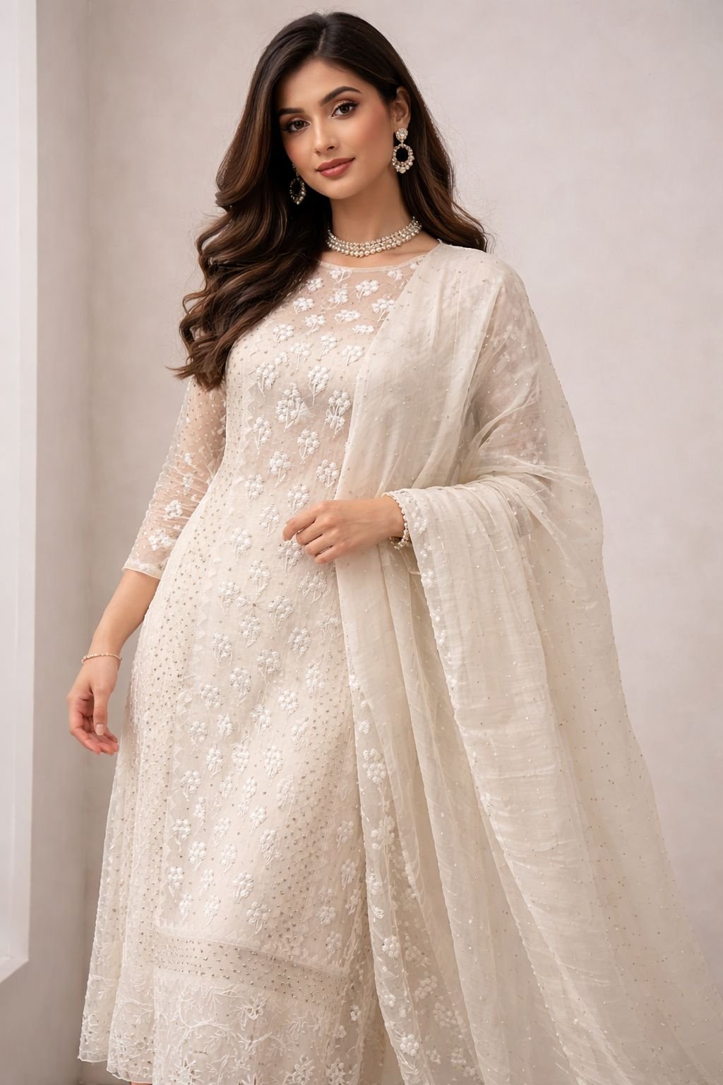 Improve your ethnic wear with this beautiful Organza Three Piece Unstitched Suit with Mukaish & Chikankari Work. This suit will give you a perfect ethnic as well as modern look. The Organza Three Piece Unstitched Suit with Mukaish & Chikankari Work comes in a beautiful ivory beige color.