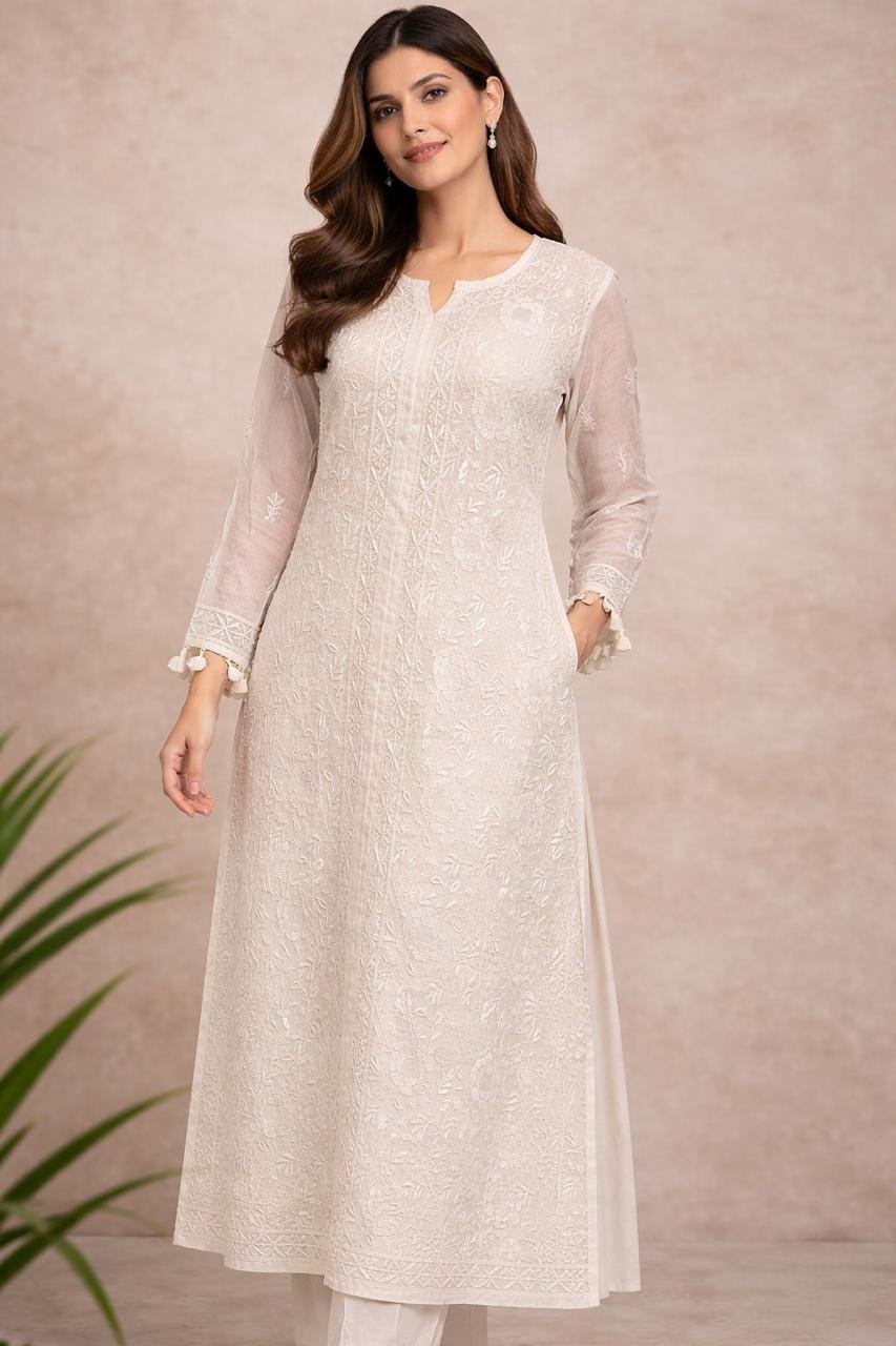 The Organza fabric will give your attire an ethereal look. The Chikankari will give your overall attire an ethnic look with the floral designs on the kurta. The Mukaish Work will add to the beauty of your attire with a subtle sheen.