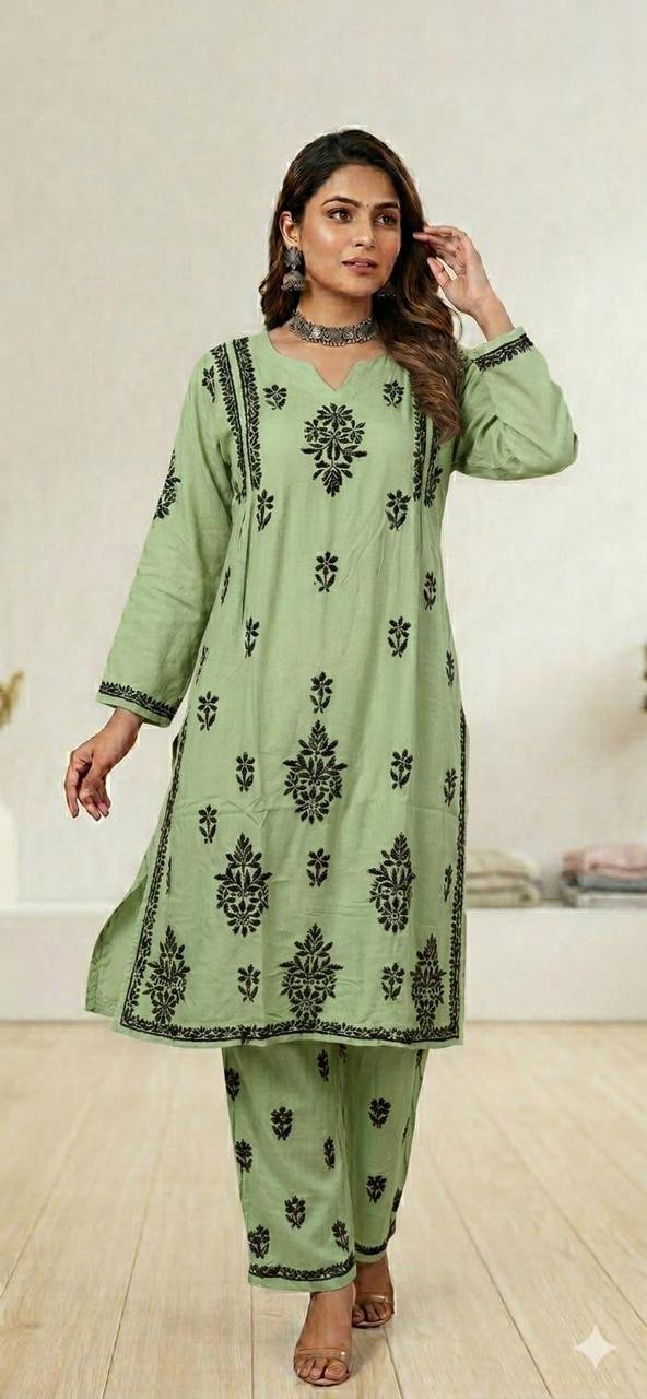 Rayon Kurta and Lower Set with Chikankari Work | Green Base with Black Embroidery