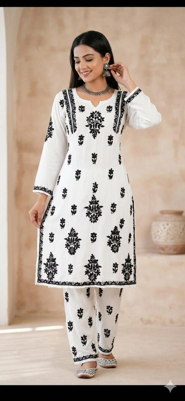 Rayon Kurta and Lower Set with Chikankari Work | White Base with Black Embroidery