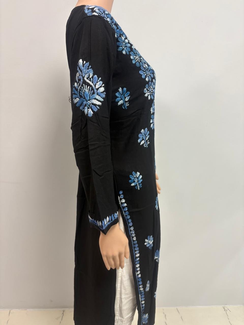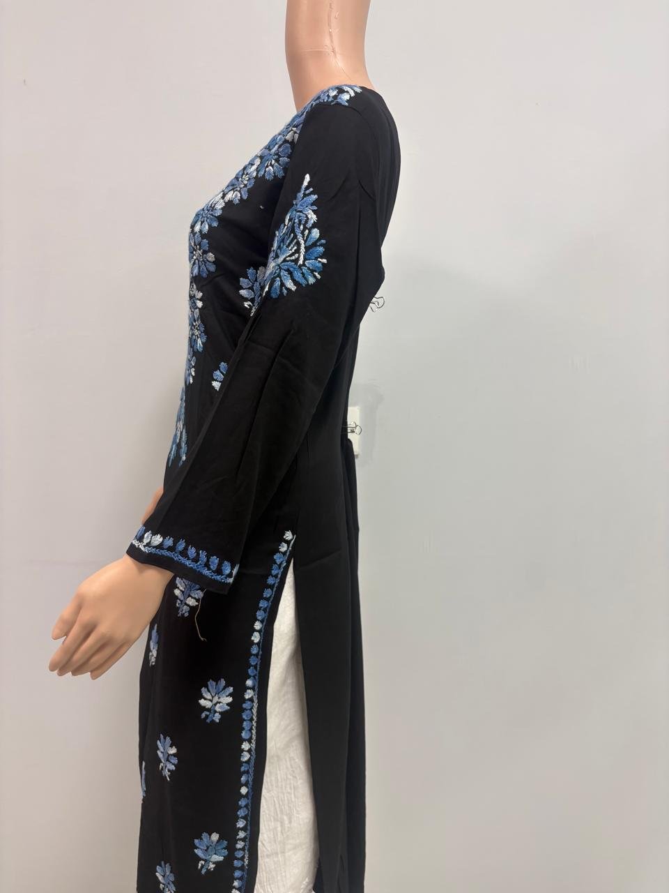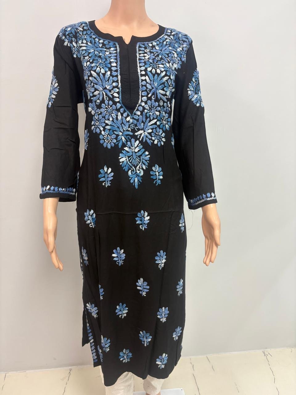 Rayon Long Kurti with Dual Color Chikankari Work | Blue and White with Black Base
