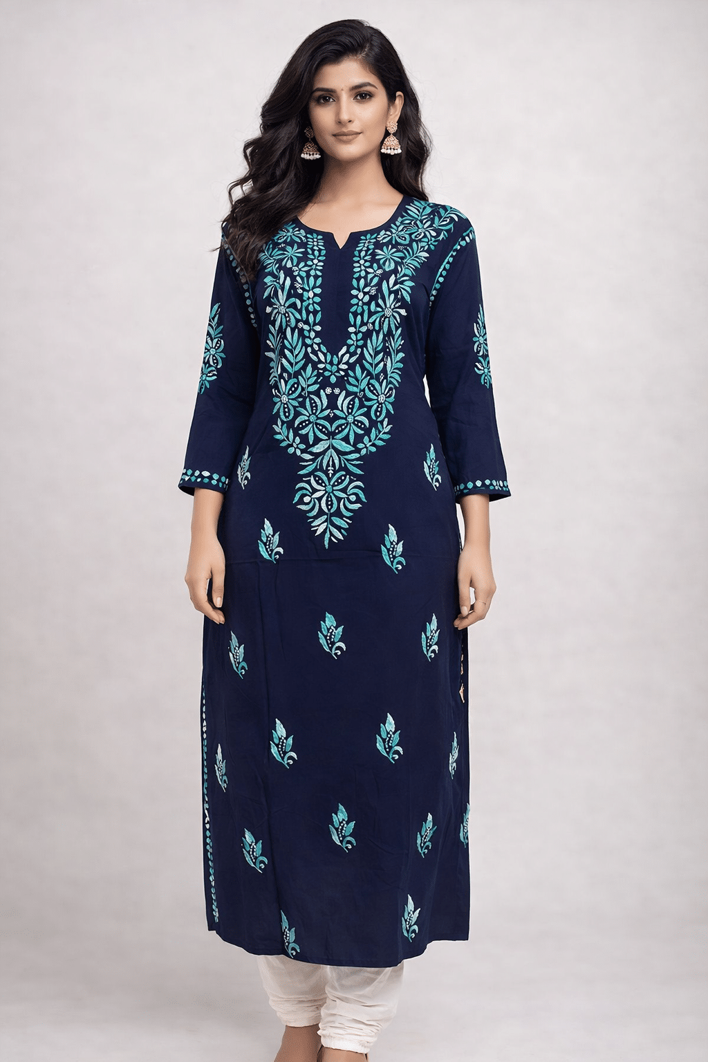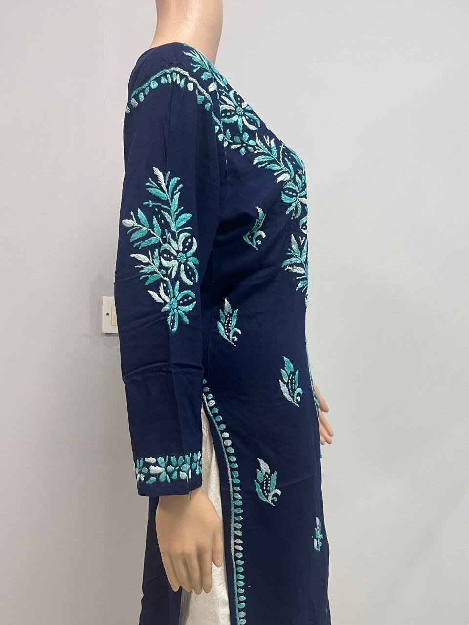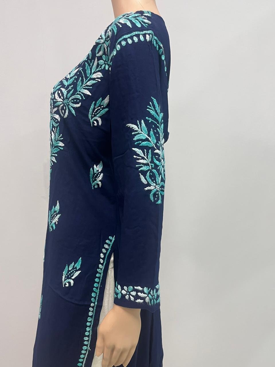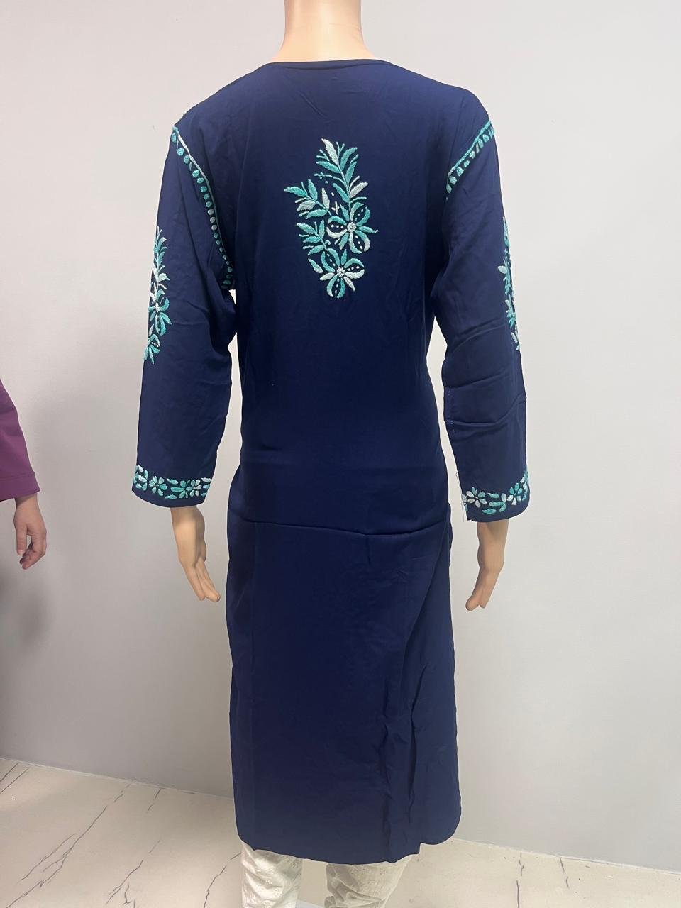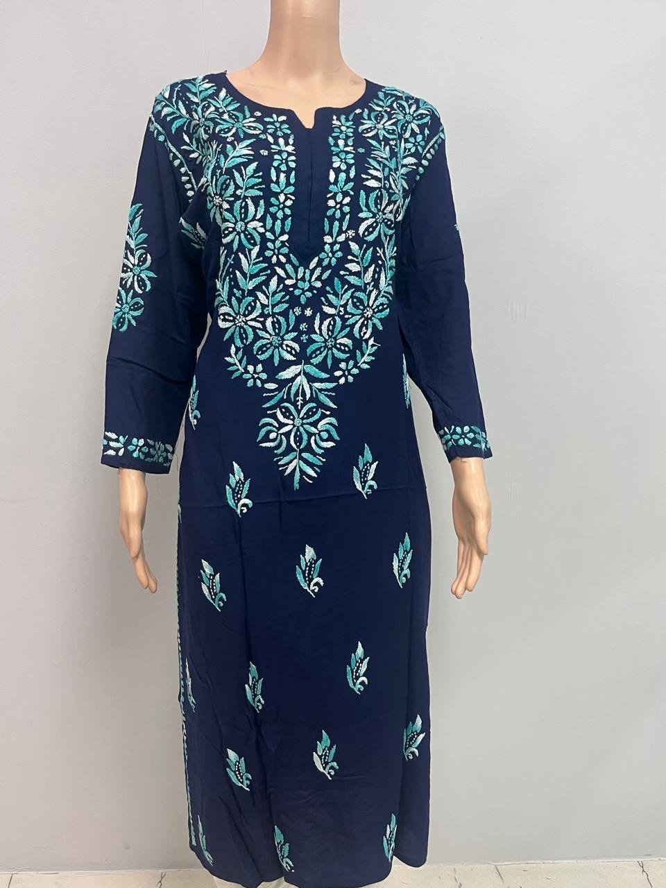 Rayon Long Kurti with Dual Color Chikankari Work | Light Blue and white with Blue Base