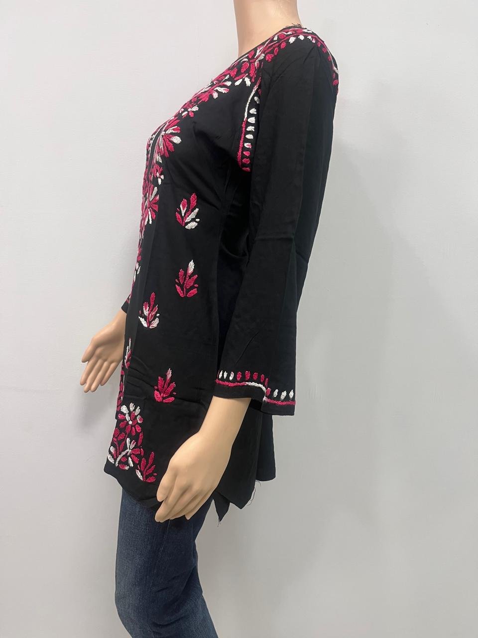 Rayon Short Kurti with Dual Color Chikankari Work | Dark Pink and White with Black Base